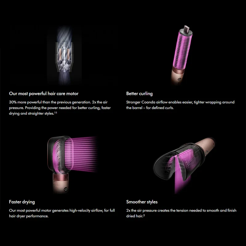 موتور Dyson Hyperdymium™ 2 : سریعترین و قدرتمندترین موتور مراقبت از موی دایسون که دو برابر فشار هوای بیشتر در مقایسه با Airwrap های نسل قبلی را تولید میکند و موهای شما را به سرعت یک سشوار حرفهای خشک میکند. با چرخش تا ۱۵۰,۰۰۰ دور در دقیقه، فشار ۷kPa ایجاد میکند تا تاثیر گذاری اثر Coanda را افزایش دهد، پیچیده شدن بهتر موها دور سری فر کننده و حالتدهی سریعتر را امکانپذیر می سازد.