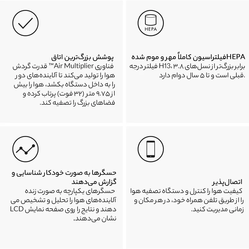 تصفیه هوای Dyson Purifier Big+Quiet BP03 با طراحی مدرن و فناوری پیشرفته، انتخابی ایدهآل برای داشتن هوایی پاک و سالم در خانه است. این دستگاه با بهرهگیری از فیلتر HEPA 13 قادر است تا 99.95٪ از ذرات معلق بسیار ریز تا قطر 0.1 میکرون را جذب کند. فیلتر کربن فعال آن نیز بوهای نامطبوع و گازهای مضری مانند فرمالدهید و دیاکسید نیتروژن را از بین میبرد. سنسورهای هوشمند داخلی بهطور مداوم کیفیت هوا را پایش کرده و بهصورت خودکار عملکرد دستگاه را تنظیم میکنند. اطلاعات لحظهای از وضعیت هوا از طریق صفحهنمایش LCD به کاربر نمایش داده میشود. با قابلیت تنظیم 3 حالته زاویه پرتاب باد، هوا بهطور یکنواخت در تمام فضای اتاق پخش میشود. طراحی بدون پره، استفاده از دستگاه را ایمن و بیصدا کرده و آن را مناسب برای فضاهایی مانند اتاق خواب میسازد. وجود حالتهای مختلف از جمله حالت شب، اتوماتیک و ECO مصرف انرژی را بهینه کرده و راحتی بیشتری فراهم میکند. همچنین با اپلیکیشن Dyson Link میتوان از راه دور دستگاه را کنترل و برنامهریزی کرد. ترکیب این ویژگیها، Dyson BP03 را به یکی از کاملترین و کارآمدترین دستگاههای تصفیه هوا در بازار تبدیل کرده است.