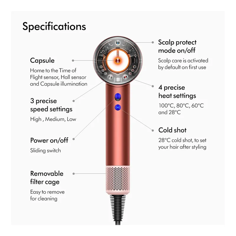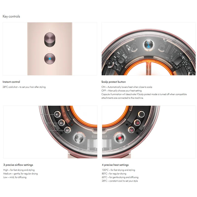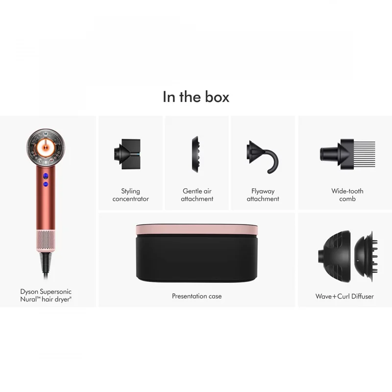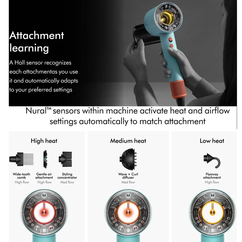 برند دایسون یکی از مطرح ترین و بهترین برندهای روز دنیا در تولید لوازم برقی باکیفیت است که با سشوارهای قوی و با کیفیت و همچنین با طراحی زیبای خود شناخته میشود. این شرکت همواره در تلاش است با حفظ کیفیت در محصولات خود میان برندهای دیگر منحصر به فرد بوده و امضای خود را به واسطه زیبایی ظاهری بر روی محصولاتش حفظ کند. سشوار دایسون مدل Supersonic nural یکی از محصولات این برند بوده که با با فناوری سریع و هوشمند بدون گرمای شدید، یک جت هوای کنترل شده با فشار بالا و سرعت بالا برای خشک کردن سریع مو ایجاد میکند. این سشوار دارای پنج سری مختلف جهت کاربردهای متفاوت است که برای حالت دادن و خشک کردن مو استفاده میشود. از جمله آنها سری مدل Wave+Curl diffuser جدید دایسون که در دو حالت مواج و فر موهای مجعد را در حالتی بسیار طبیعی خشک می نماید می توان اشاره کرد.این سشوار برای انواع مو از جمله موهای فر و حالتدار و همچنین صاف و لخت قابل استفاده است و هیچ گونه آسیبی به موهای شما نمیزند.