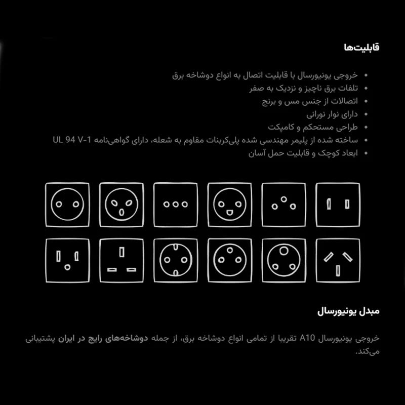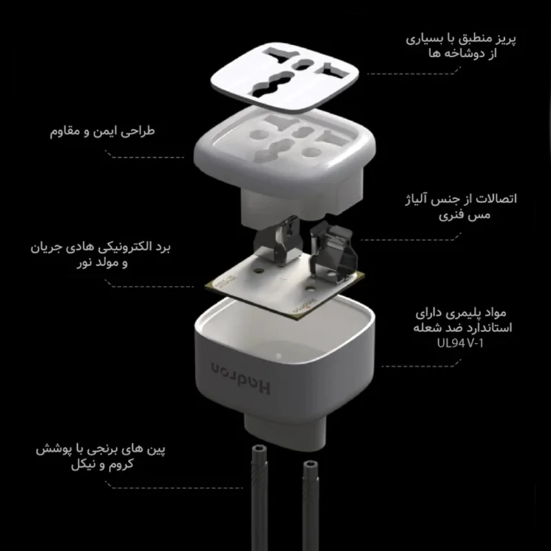 تبدیل دوشاخه برق هادرون مدل A10 دارای گارانتی مادامالعمر هادرون توان میباشد.