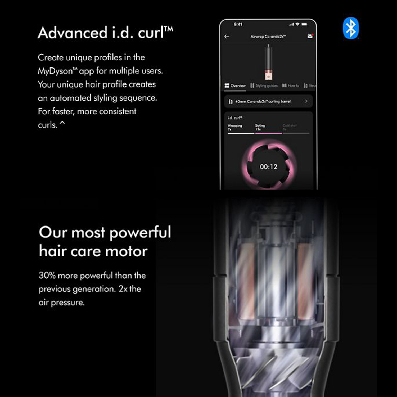 - دارای قابلیت هوش مصنوعی در حالت‌دهی: برای اولین بار، Dyson Airwrap به کمک اپلیکیشن MyDyson و اتصال بلوتوث به آن، تنظیمات شخصی‌سازی‌شده شامل نوع مو، جهت چرخش، دما و زمان را ذخیره و اجرا می‌کند و در این نسل جدید Airwrap Co-anda2X بازدهی و دقت این تکنولوژی بالاتر هم رفته.