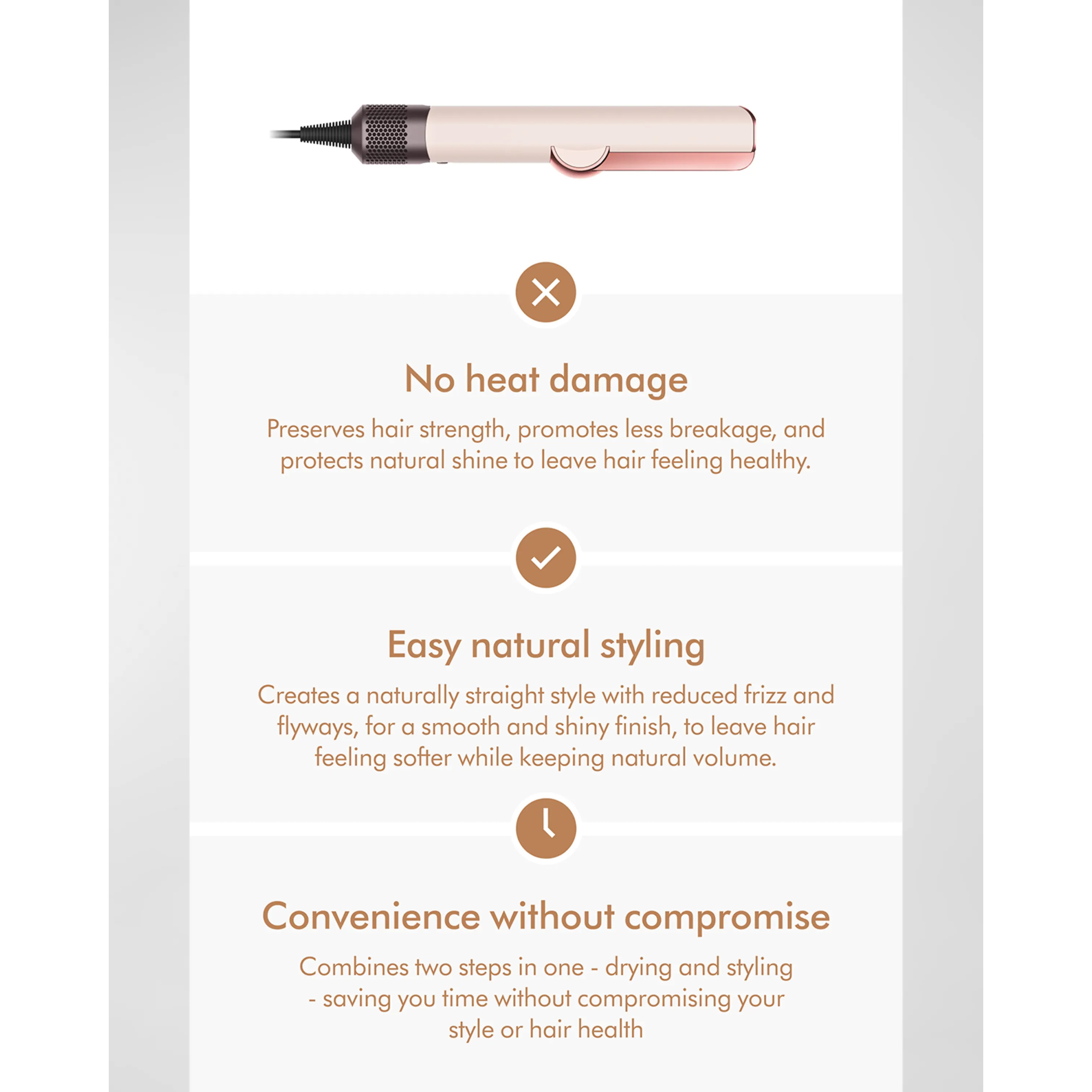 Airstrait انتهای اعجاب محصولات دایسون را هدف قرار گرفته است. محصولی که در دسته بندی اتو مو قرار میگیرد و سشوار هم هست اما تفاوت های بسیار زیادی با اتو موهای رایج در دنیا دارد. این محصول تحقق شعار کمپانی دایسون است که سلامتی کاربران خود، برایش از همه چیز مهمتر است. محصولی با کیفیت ساخت فوق العاده بالا که برخلاف اتو موهای دیگر که با داغ شدن صفحات، موجب آسیب و سوختگی موها میگردند، تنها از جریان باد برای خشک و صاف کردن موهای شما استفاده میکند.