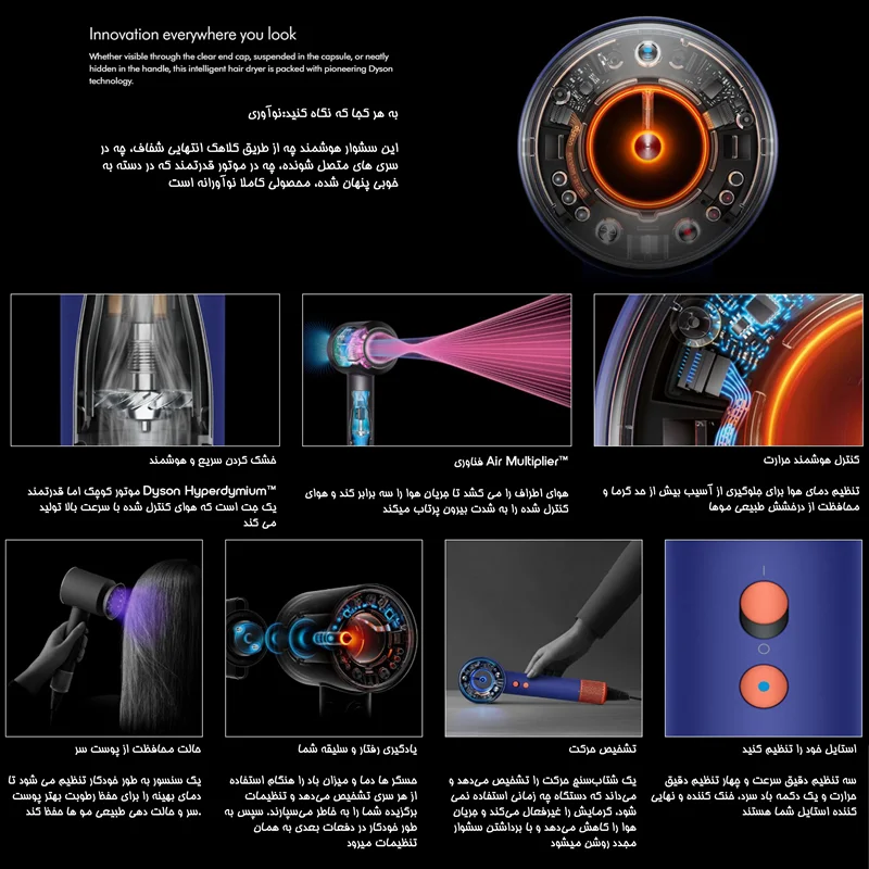 برند دایسون یکی از مطرح ترین و بهترین برندهای روز دنیا در تولید لوازم برقی باکیفیت است که با سشوارهای قوی و با کیفیت و همچنین با طراحی زیبای خود شناخته میشود. این شرکت همواره در تلاش است با حفظ کیفیت در محصولات خود میان برندهای دیگر منحصر به فرد بوده و امضای خود را به واسطه زیبایی ظاهری بر روی محصولاتش حفظ کند. سشوار دایسون مدل Supersonic nural یکی از محصولات این برند بوده که با با فناوری سریع و هوشمند بدون گرمای شدید، یک جت هوای کنترل شده با فشار بالا و سرعت بالا برای خشک کردن سریع مو ایجاد میکند. این سشوار دارای پنج سری مختلف جهت کاربردهای متفاوت است که برای حالت دادن و خشک کردن مو استفاده میشود. این سشوار برای انواع مو از جمله موهای فر و حالتدار و همچنین صاف و لخت قابل استفاده است و هیچ گونه آسیبی به موهای شما نمیزند.
