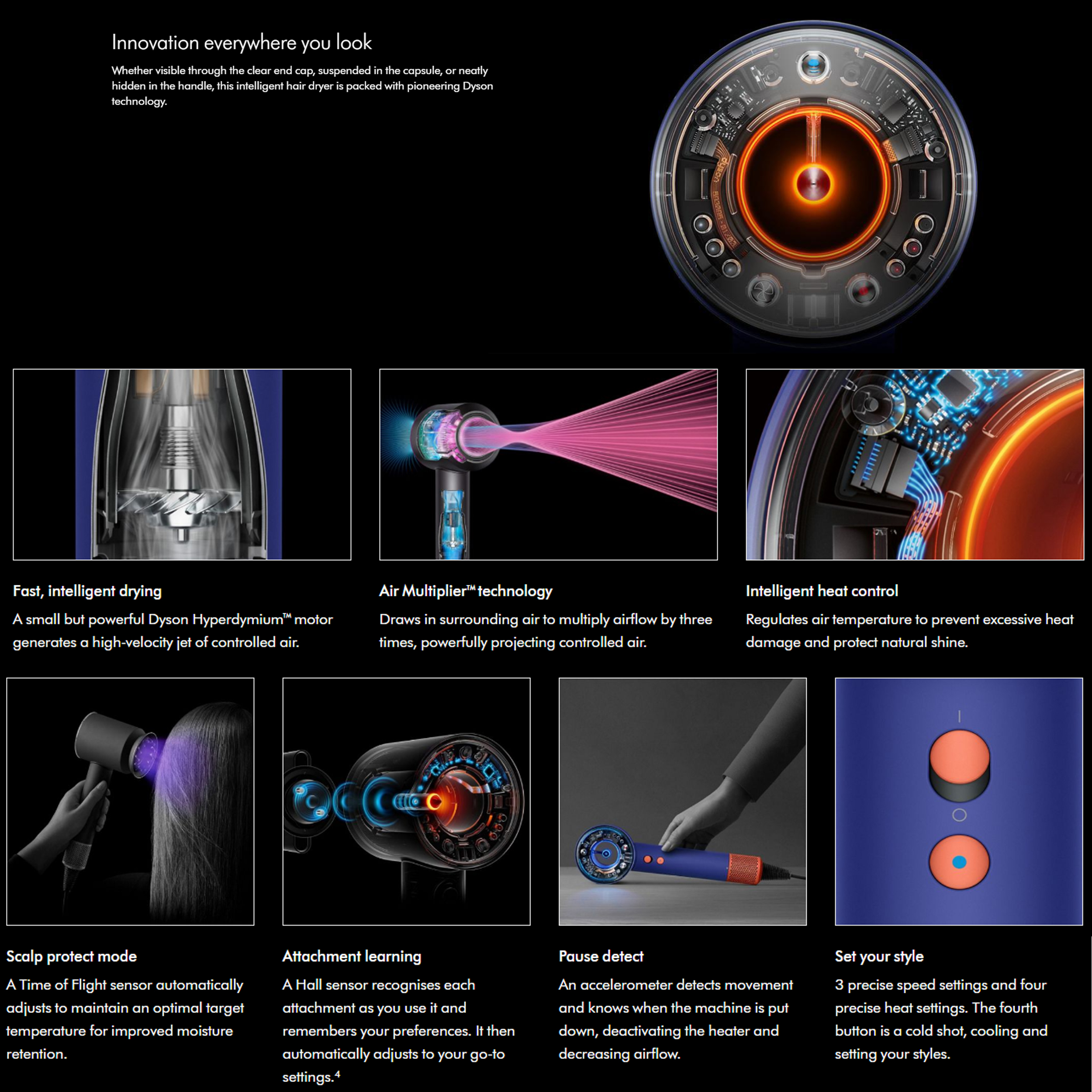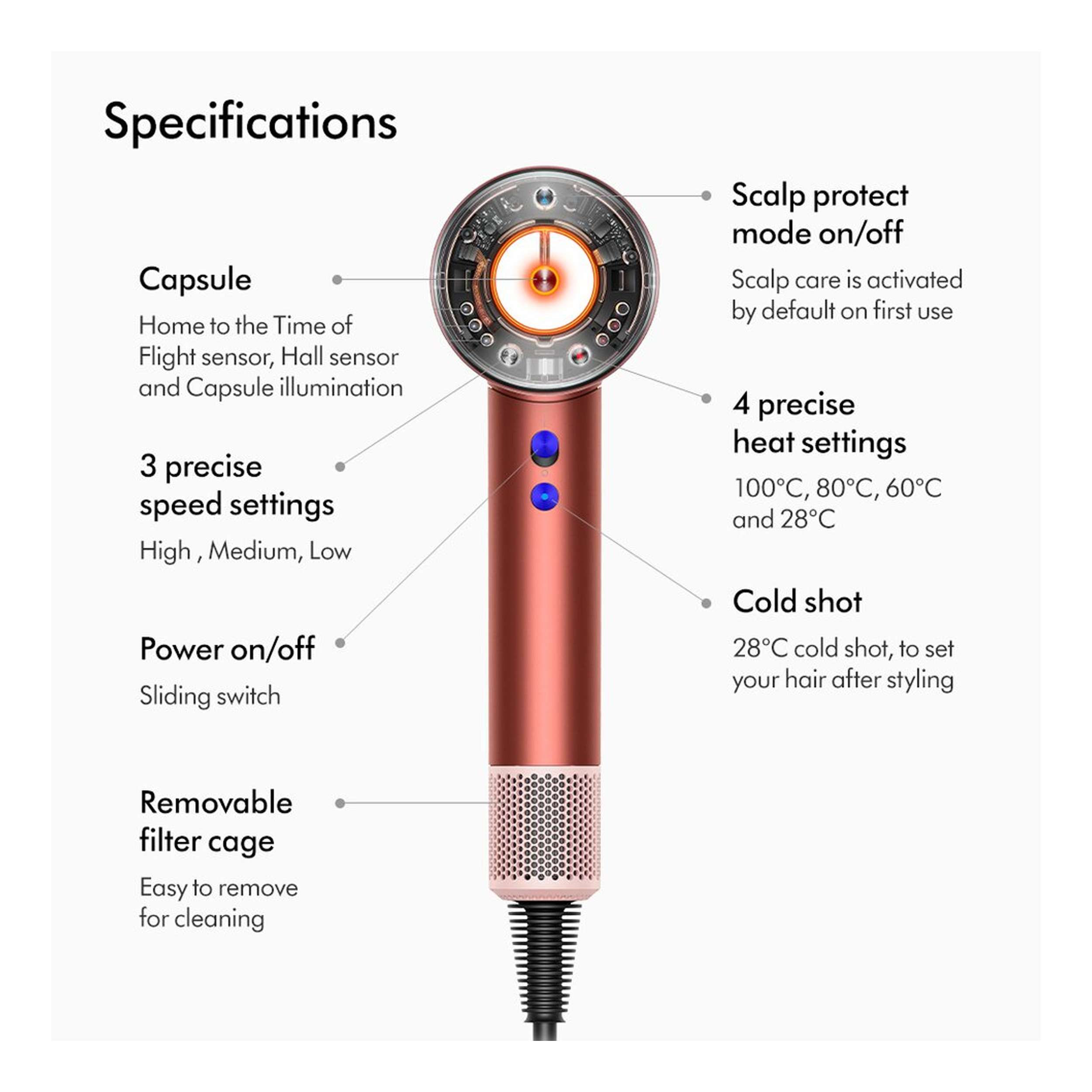 - دارای سنسور تشخیص میزان فاصله سشوار از سر برای کاهش یا افزایش میزان دما به صورت خودکار جهت عدم آسیب رساندن به پوست و موی سر