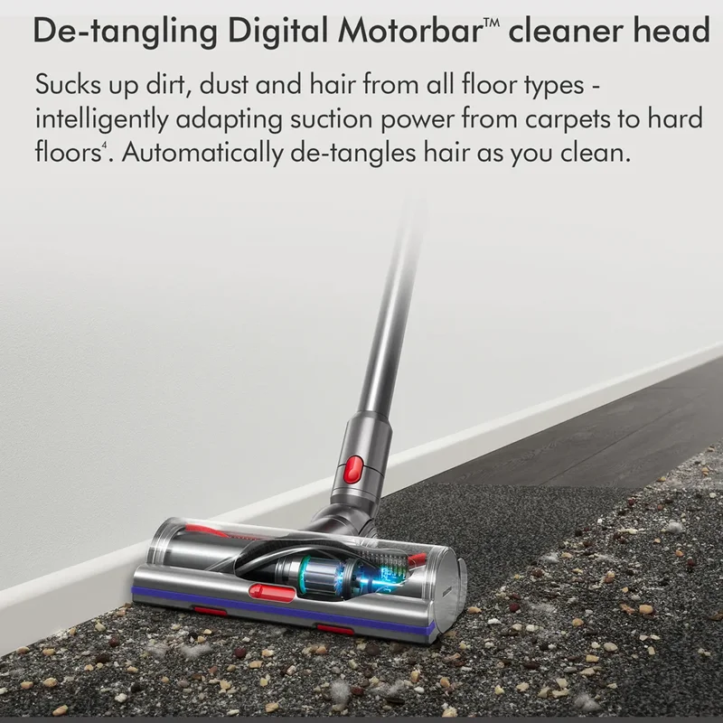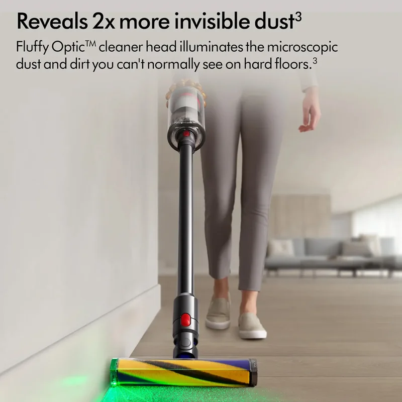 شما میتوانید سه حالت مختلف قدرت و سرعت را روی صفحه LCD ببینید. شما در حالت Eco مدت زمان کار بیشتری به تمیز کردن اختصاص میدهید که این حالت معمولاً برای تمیز کردن گسترده مناسب است. حالت دوم حالت تقویت(Boost) است که شدت بیشتری دارد و برای تمیز کردن کوتاه مناسب است. حالت سوم که استاندارد و کمترین سرعت است،بر روی افزایش عمر باتری نیز تاثیر دارد. جاروعصایی Dyson V۱۵ DETECT به کمک سری Fluffy Optic قادر است ذراتی را که شما به طور طبیعی و معمول نمیتوانید ببینید را مشخص نماید. این جارو میتواند یک پرتو زاویهدار دقیق از گرد و غبارهای نامرئی که روی کفهای سخت مانند سنگ، سرامیک، پارکت وجود دارد را برای شما قابل دیدن نماید. دارای باتری پر قدرت است که هر باتری کلیکی میتواند تا ۶۰ دقیقه با یک شارژ خانه یا محل کار شما را تمیز نماید. این دستگاه دارای شانه گرهزدایی Hair ScrewTool است که به طور خودکار میتواند موها را از نوار چرخان داخل برس جدا و پاک نماید. در Dyson V۱۵ سطل زباله و سریها را میشود به آسانی تمیز کرد، فیلتر و برس غلتکی قابل شستشو میباشند، عملکرد بهتری دارند و میکروبها و ویروسها و قارچها را میتوان از بین برد. Dyson V۱۵ دارای LCD است و میتواند میزان و زمان گرد و غبار مکش شده را به شما نشان دهد. جاروعصایی Dyson V۱۵ DETECT دارای Motorbar دیجیتال با پرههای از بین برنده مو است که میتواند گرد و غبار، زباله و مو را از خانه یا محل کار شما به خوبی جمع کند و خانه شما را تمیز نماید. Dyson V۱۵ دارای یک سنسور پیزو است که میتواند به طور مداوم ذرات گرد و غبار خانه شما را اندازهگیری کند و سپس شمارش نماید؛ حال اگر احتیاج بود جارو به صورت خودکار میتواند قدرت مکش را بالا ببرد تا تمام ذرات گرد و غبار تمیز گردد. این دستگاه میتواند به طور خودکار بسته به عمق انواع فرش تان، به خوبی فرشهای شما را جارو کند و گرد و غبار و آلودگیها را از عمق آن بیرون بیاورد. Dyson V۱۵ میتواند با کمک فناوری تطبیقپذیری باعث تمیز کردن خانه یا محل کار شود.