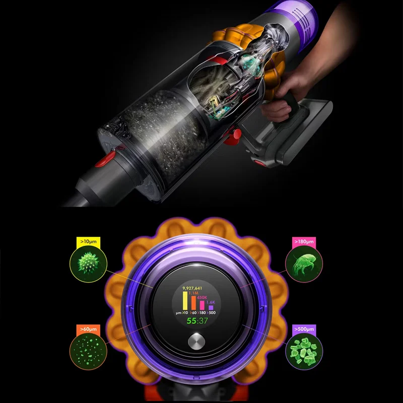 جاروعصایی Dyson V15 Detect Total Clean دارای فناوری Root Cyclone است که بتواند طوفانهای پیمایشی تولید نماید و این نیروها تا 100000g تولید میکنند تا بهتر بتوانند گرد و غبار و ذرات جریان هوا را به خوبی جذب کنند و مکشی متناسب داشته باشند. این جارو عصایی دارای فیلتراسیون چند مرحلهای از نوع فیلترهای HEPA میباشد و میتواند فیلتراسیون دقیق انجام دهد یعنی قادر است که ذرات میکروسکوپی و ذرات آلرژنزا را تا 99.99% به دام بیندازد. این دستگاه ذرات میکروسکوپی کوچک تا 0.3 میکرونی را به خوبی شناسایی نماید و به خود جذب می کند. این دستگاه میتواند هوای خانه یا محل کار شما را تمیزتر کند و هوای پاکتری تحویل شما بدهد. Dyson V15 دارای رشتههای فیبر کربن است که این رشتهها ضد الکتریسیته ساکن هستند و باعث خارج کردن گرد و غبار از کفهای سخت مانند سرامیک، سنگ و یا پارکت میشوند. جاروعصایی Dyson V15 دارای فناوری Dyson DLS است که میتواند در حالت خودکار سرعت گردش داخل سر تمیزکننده را با گشتاور بالا و مقاومت میله برس، برابر با 360 بار در ثانیه مانیتور نماید و میتواند بهطور خودکار قدرت را در انواع مختلف کف تطبیق دهد. Dyson V15 دارای موتور Dyson Hyperdymium است؛ این موتور از نوع دیجیتال میباشد، سبک وزن و قدرتمند نیز هست. این موتور قادر است که حدود 125000 دور در دقیقه بچرخد تا تمام گرد و غبارهای میکروسکوپی و زبالههای بزرگ را به راحتی بخورد و خانه شما را تمیز نگه دارد.